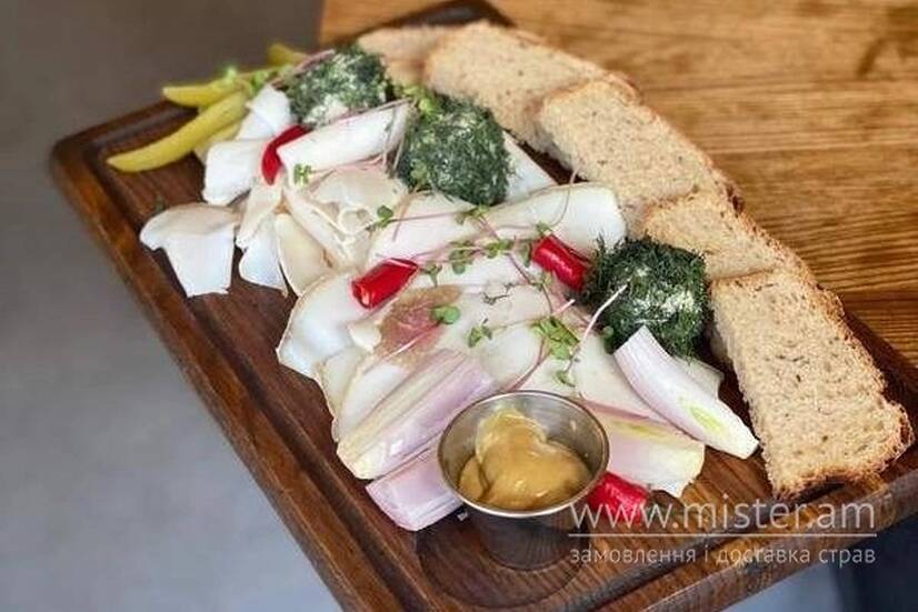 Бочок, сало, сало перемелене з часником, маринований огірок, цибуля, гірчиця, хліб.