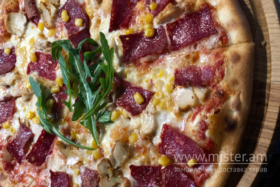 Соус на томатах, моцарелла, курка, салямі, кукурудза.