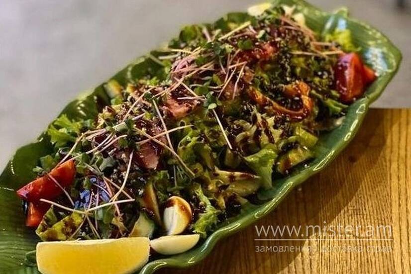 Тунець філе, салатний мікс, перець болгарський, маслини, авокадо, соус нісуаз, соус унагі.