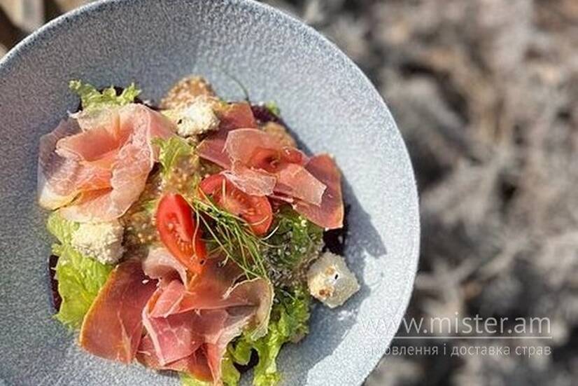 Буряк, рукола, прошуто, бринза, кедрові горіхи, олія оливкова, соєвий соус, мед.