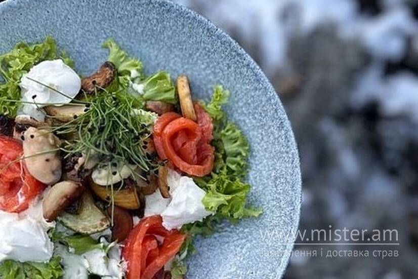 Мікс салату, лосось маринований, підсмажені гриби та цукіні, сир Філадельфія та соус цезар.