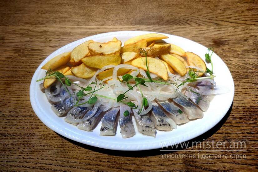 Оселедець солений, картопля смажена, цибуля маринована.