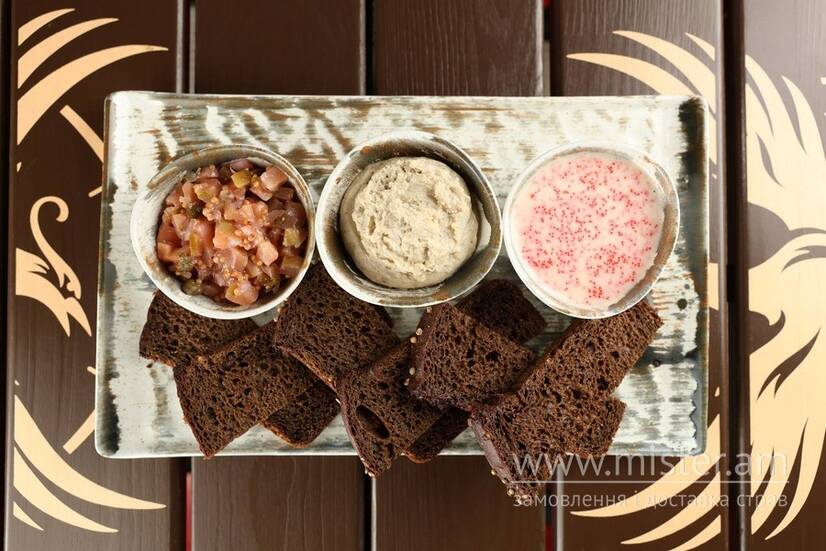 Ікорне масло, оселедцевий паштет, тар тар з лосося ; бородинський хліб.