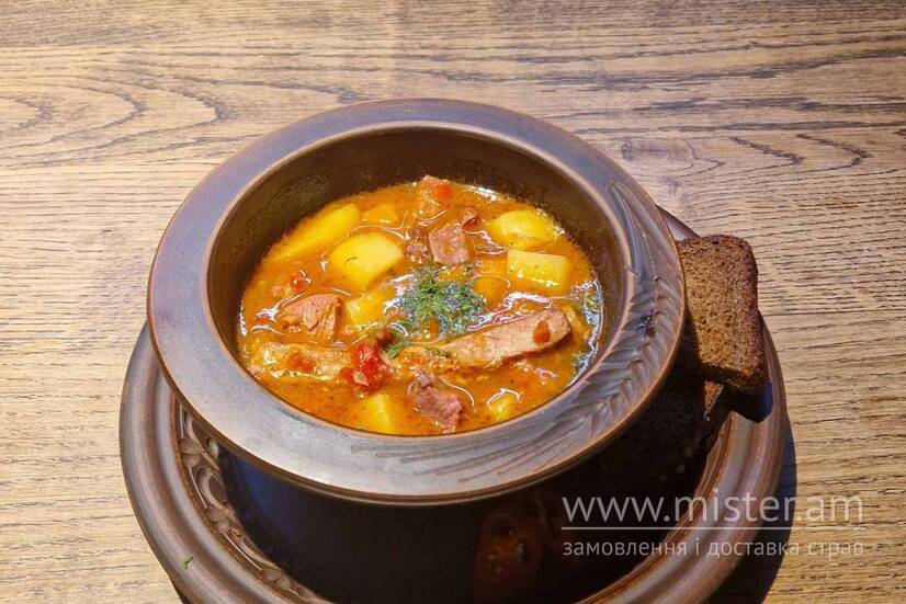 Картопля, морква, цибуля, перець болгарський, свинина, телятина, томатна паста, гострі приправи.