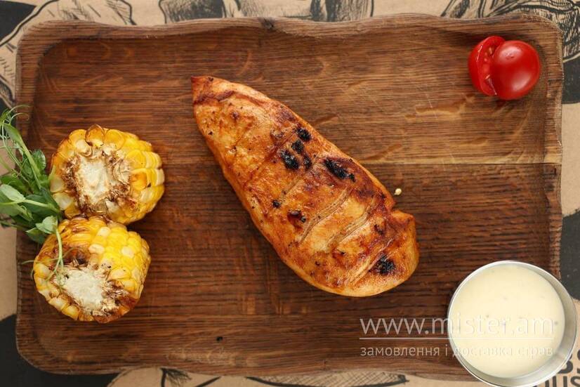 Стейк курячий на грилі, подається з соусом Цезар та кукурудзою гриль.