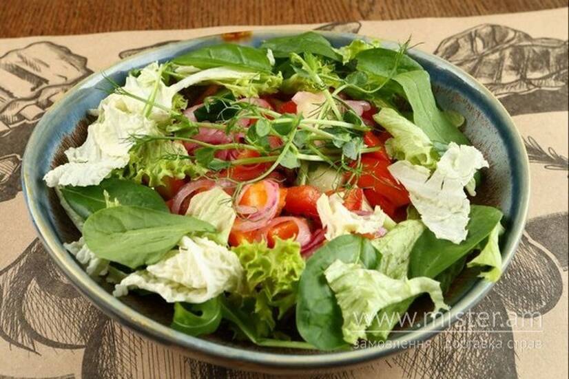 Огірок, помідор, перець болгарський, мікс салату, синя цибуля. Приправа оливкова олія або сметана на вибір.