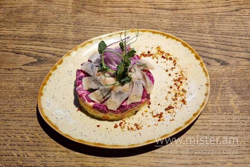 Картопля, морква, буряк, оселедець, цибуля, соус стейковий.