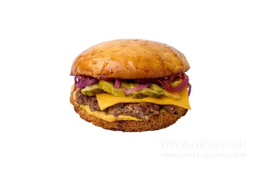 Чеддер, котлета, огірок маринований, цибуля синя маринована, кетчуп, гірчиця.