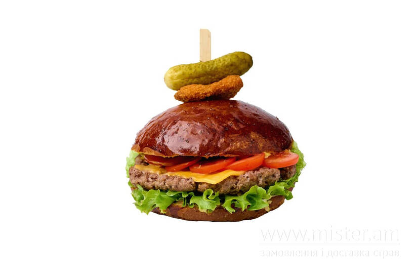 Котлета, вино червоне сухе, чеддер, нагетс по-англійськи, пікантний корнішон, салат, чері, гірчиця, Spring sauce.