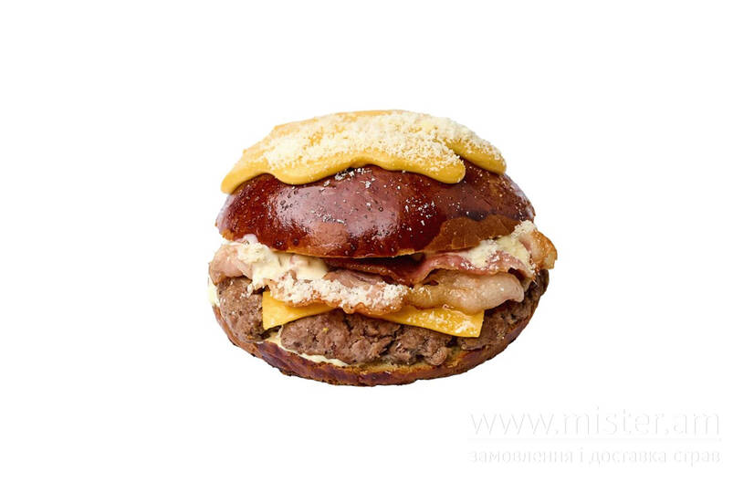 Яловича котлета, Parmigiano reggiano, чеддер, карамелізована цибуля, айолі, бекон, сирний соус.