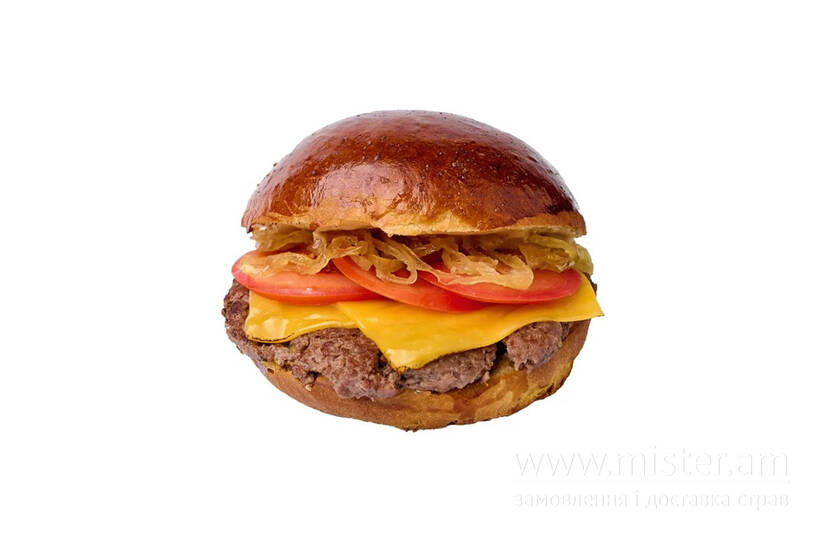 Котлета, карамелізована цибуля, томат, соус ява, чеддер.
