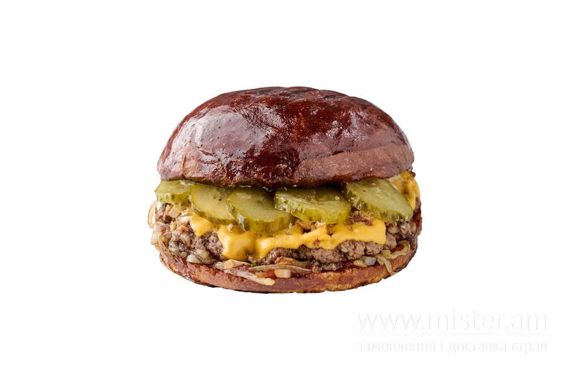 Яловича котлета, біла цибуля, кетчуп, Чеддер, айолі, суха цибуля, маринований огірок.