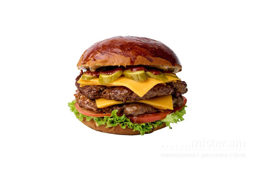 Подвійна яловича котлета, салат, томат, маринований огірок, чеддер, шрірача, соус Smoked jalapeno.