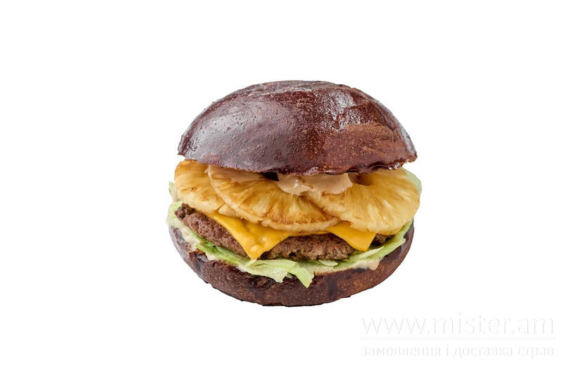 Яловича котлета,Чеддер,солодка цибуля, Sweet Honey Moon Sauce, кетчонез, grilled pineapple, демарара,салат.