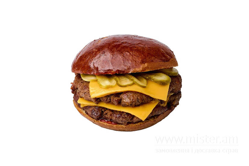 Подвійна яловича котлета, чеддер, маринований огірок, карамелізована цибуля, Smoked paprika sause.