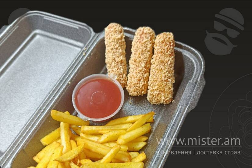 Сирні палички 3 шт., картопля фрі, соус на вибір.