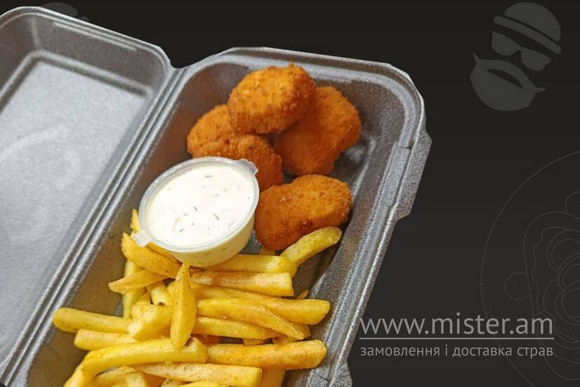 Нагетси 5 шт., картопля фрі, соус на вибір.