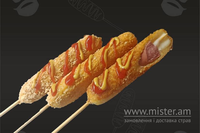 Молочна сосиска, моцарела, кукурудзяний кляр, панірувальні сухарі "Панко".