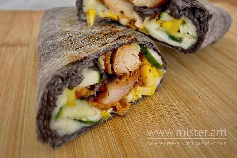 Моцарела, м`ясо курки, свіжий огірок, болгарський перець, кукурудза, соус на вибір (часниковий або медовий з гірчицею).