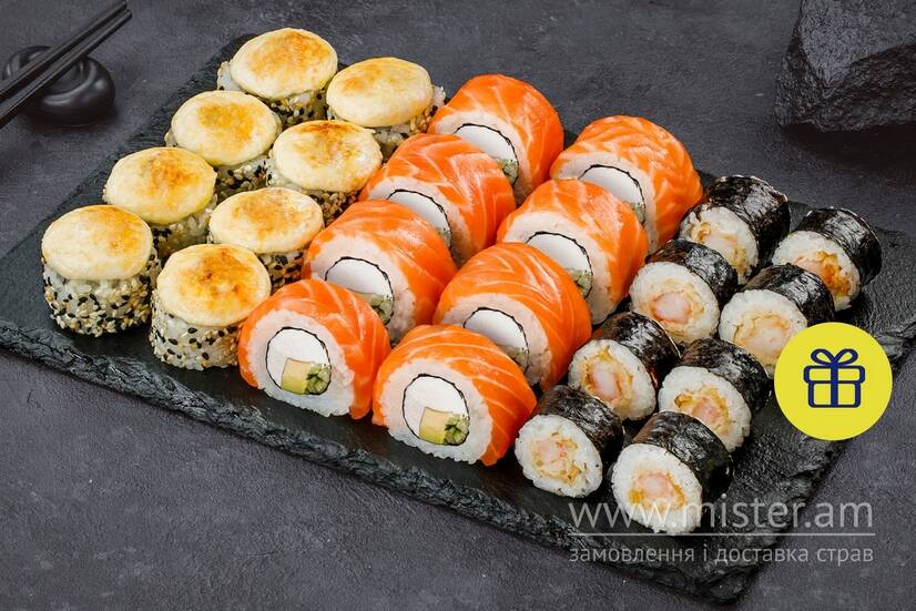 Філадельфія з лососем, Запечений з крабовим міксом. 🎁 У ПОДАРУНОК: Макі з креветкою. Соєвий соус - 80 мл (2 шт). Імбир - 20 г. Васабі - 10 г.