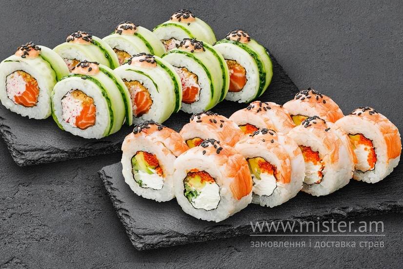 Рол з лососем та огірком, Філадельфія з креветкою зі знижкою 50%. Соєвий соус - 40 мл (1 шт). Імбир - 10 г. Васабі - 5 г.