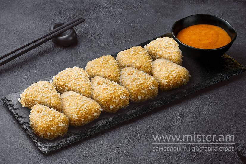 Моцарела, яйце, панірувальні сухарі, борошно темпура, соус горіховий (гострий).
