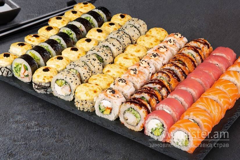 Філадельфія з лососем, Філадельфія з креветкою, Філадельфія з тунцем, Філадельфія з креветкою в кунжуті, Кранч з креветкою, Торі Рол (гострий), Запечений з крабовим міксом, Ніжний з куркою, Ніжний з лососем. Соєвий соус - 200 мл (5 шт). Імбир - 60 г. Васабі - 30 г.