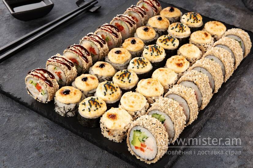Ніжний з лососем, Каліфорнія темпура, Темпура рол з куркою, Запечений з креветкою, Запечений з тунцем (гострий). Соєвий соус - 120 мл (3 шт). Імбир - 40 г. Васабі - 20 г.