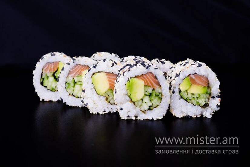 Огірки, норі, рис, кунжут, авокадо, філе лосося копчене.