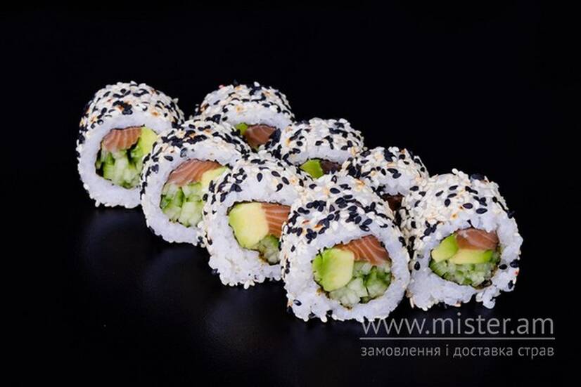 Огірки, норі, рис, кунжут, авокадо, філе лосося.