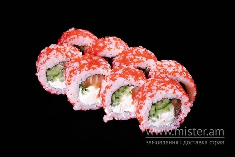 Норі, філе лосося, сир Філадельфія, огірки, рис, ікра масаго.