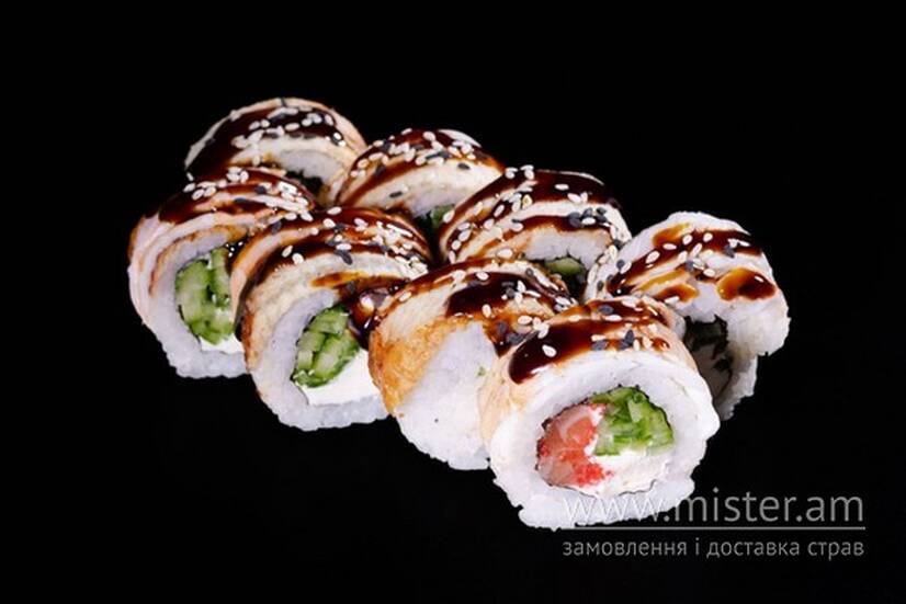 Огірки, філе лосося, ікра масаго, норі, креветки, авокадо, рис, вугор, соус унагі, кунжут, сир Філадельфія.