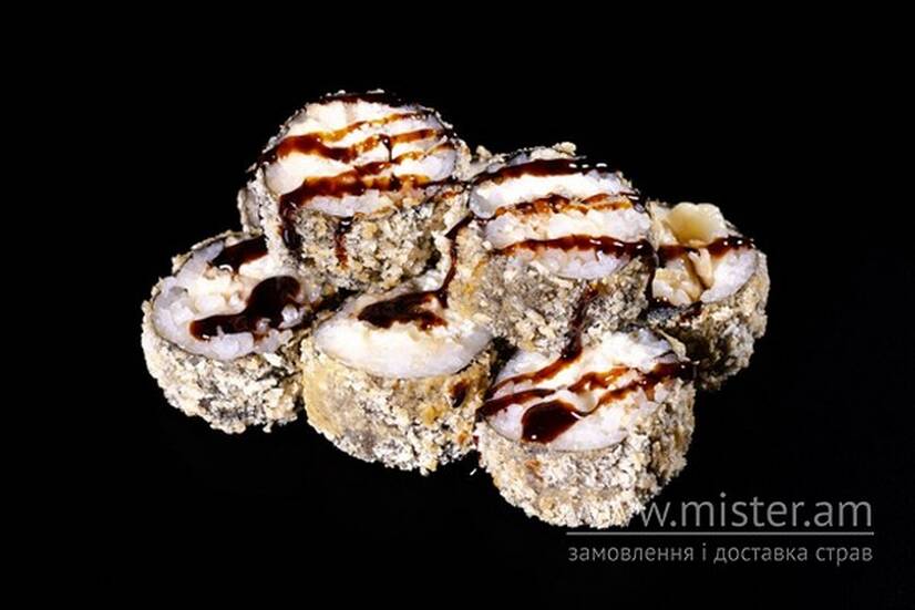 Олія рослина, паніровка суші, сир Філадельфія, креветки, норі, рис, термобокс, сир Пармезан, соус унагі, сир Моцарела.
