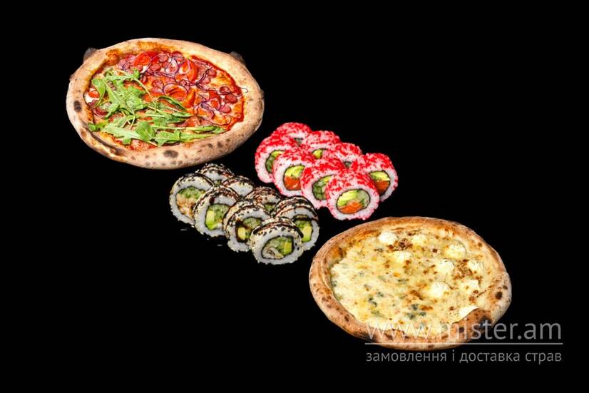 Каліфорнія лайт з лососем в ікрі, Каліфорнія з вугрем в кунжуті, піца 4 сири навпіл з піцою Класика сиру, піца Мисливська навпіл з піцою Баварія.