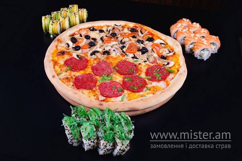 Піца "Салямі", піца "Капричоза", Філадельфія з лососем та манго, Рол Сікору, Авокадо рол з крабом.