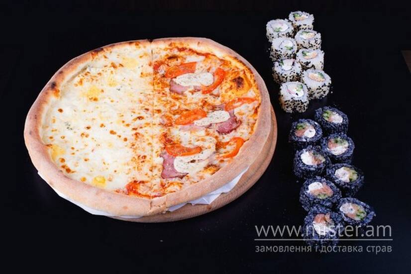 Піца "Поло", Шерл з лососем, Каліфорнія сурімі в кунжут, Каліфорнія сурімі кунжут/ікра, піца "4 сири".