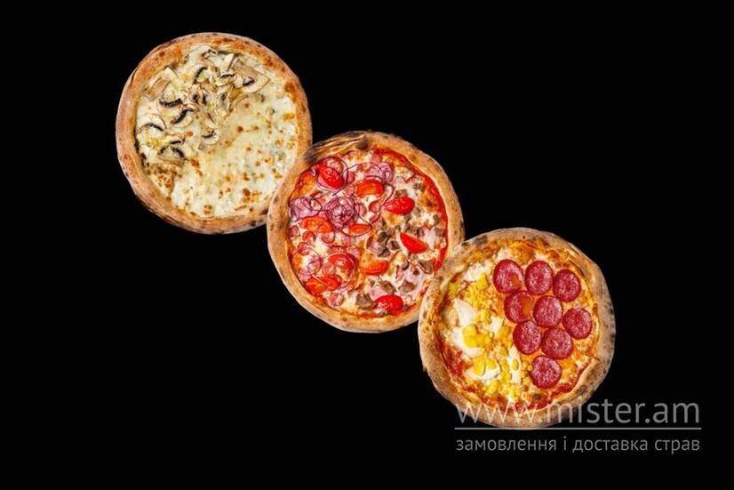 Сет із шести половинок (трьох піц): Салямі, піца з білими грибами, Мисливська, Поло, 4 сири, Улюблена дитяча піца.