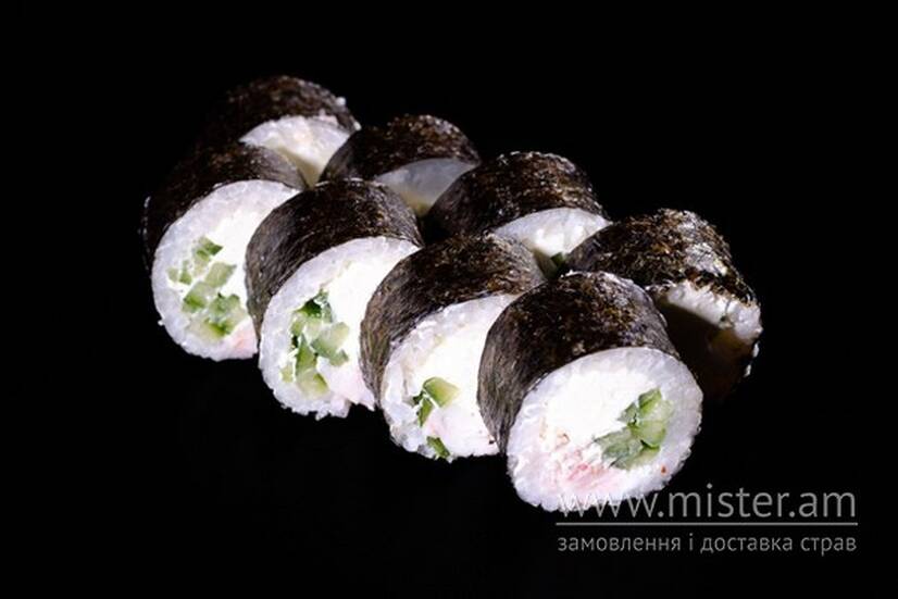 Сніжний краб, сир Філадельфія, норі, огірки, рис, креветки, японський майонез.