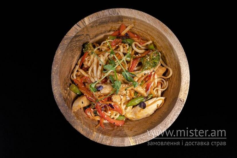 Удон, олія рослина, соєвий соус, броколі, стручкова квасоля, морква, соус фірмовий, кунжут, мікрогрін, курка гриль, болгарський перець.