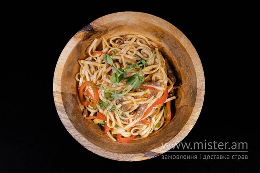 Удон, олія рослина, соєвий соус, броколі, стручкова квасоля, морква, соус фірмовий, кунжут, мікрогрін, рвана яловичина, болгарський перець.