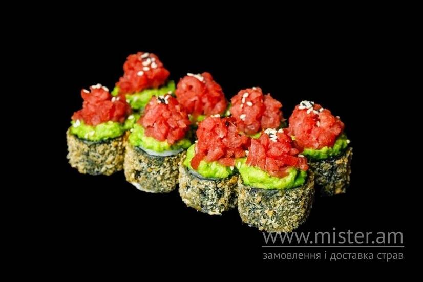 Фірмовий обсмажений панко рол, вкритий гуакамоле та маринованим тунцем. Доповнює смак філе лосося та сир Філадельфія.