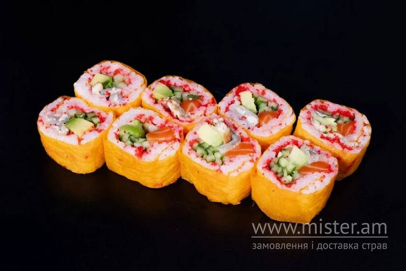 Фірмовий рол зі свіжим лососем, пряним вугром, соковитим огірком та ніжним авокадо. Рол загорнутий у яскраве маменорі.