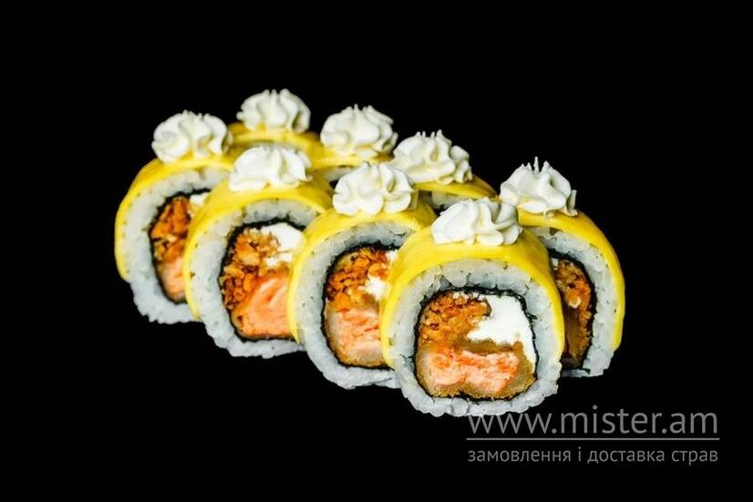 Фірмовий рол покритий сиром чедер. Лосось в темпурі, цибуля кранч, сир Філадельфія. Декорується сиром Філадельфія та поливається соусом Унагі.