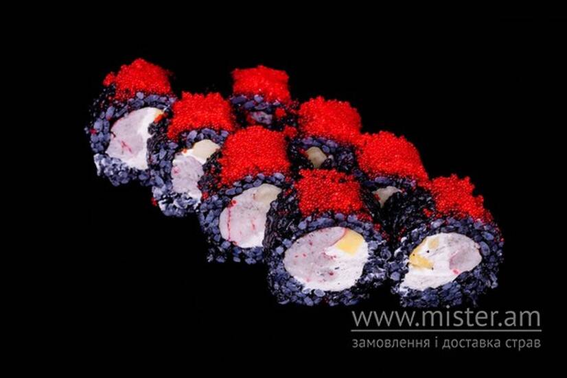 Норі, рис, сир Філадельфія, чорнило каракатиці, ікра масаго, манго, сніжний краб, майонез.