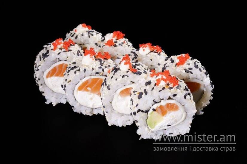 Філе лосося, сир Філадельфія, норі, рис, слайси сиру, авокадо, ікра масаго, майонез, кунжут.