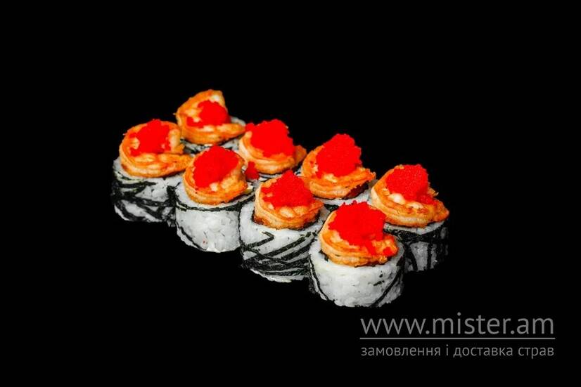 Фірмовий рол зі смаженими тигровими креветками. Всередині філе лосося та тунця, стиглий авокадо та сир Філадельфія, соус Лагідний спайсі. Декоруємо ікрою.