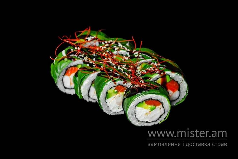 Рол, вкритий свіжим шпинатом, з лососем, креветками, авокадо, сиром Філадельфія. Поливаємо соусом Унагі.