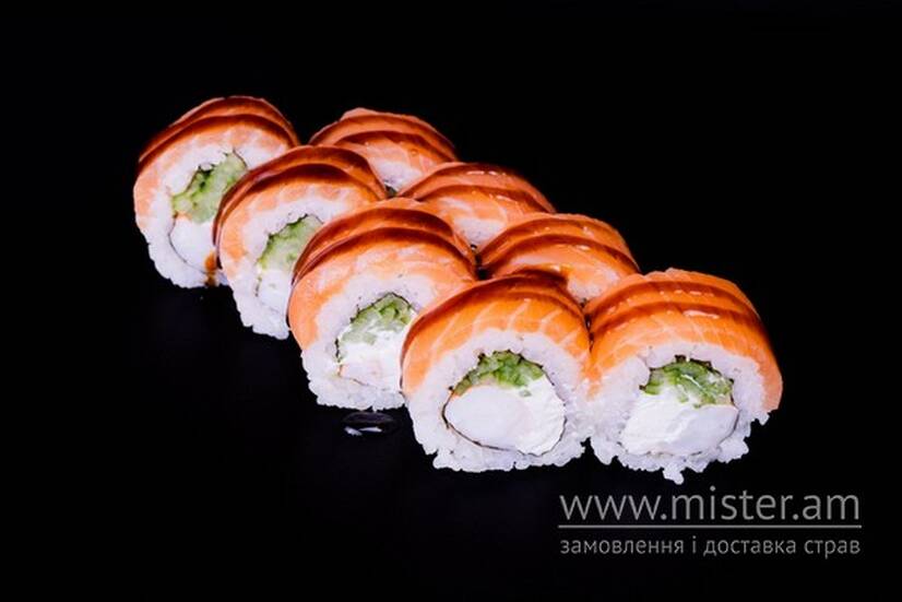 Огірки, філе лосося, сир Філадельфія, норі, креветки, соус унагі, рис.