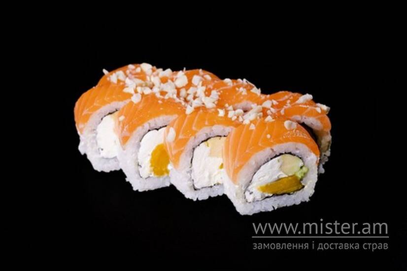 Авокадо, норі, рис, філе лосося, кеш`ю, манго, сир Філадельфія.