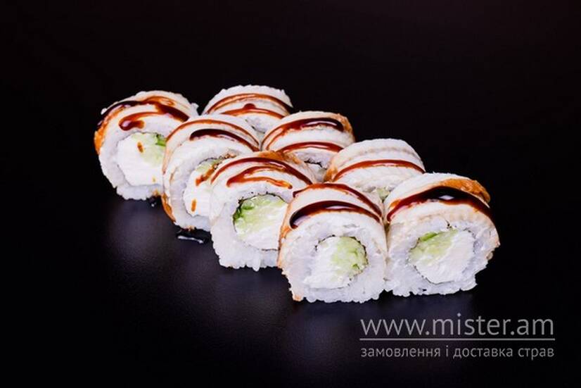 Огірки, соус унагі, вугор, норі, кунжут, рис, сир Філадельфія.